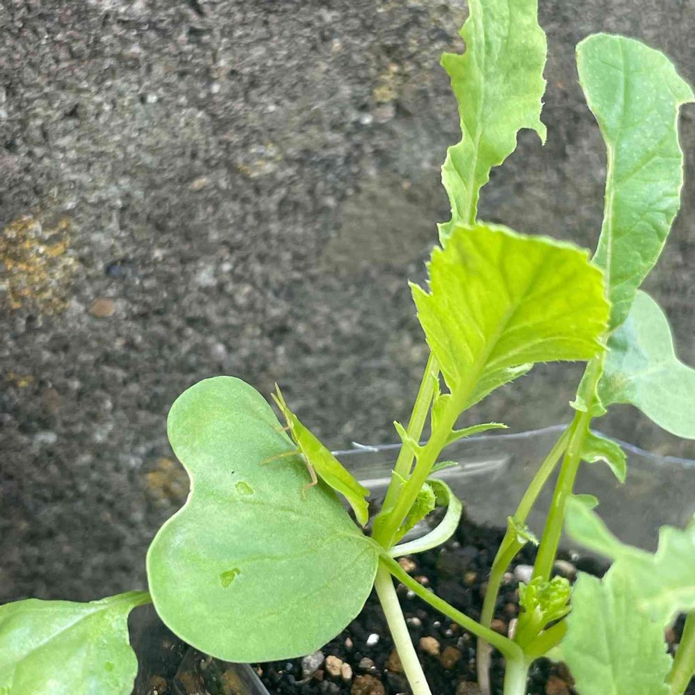 双葉がでたばかりのところに子供のバッタが住み着いて