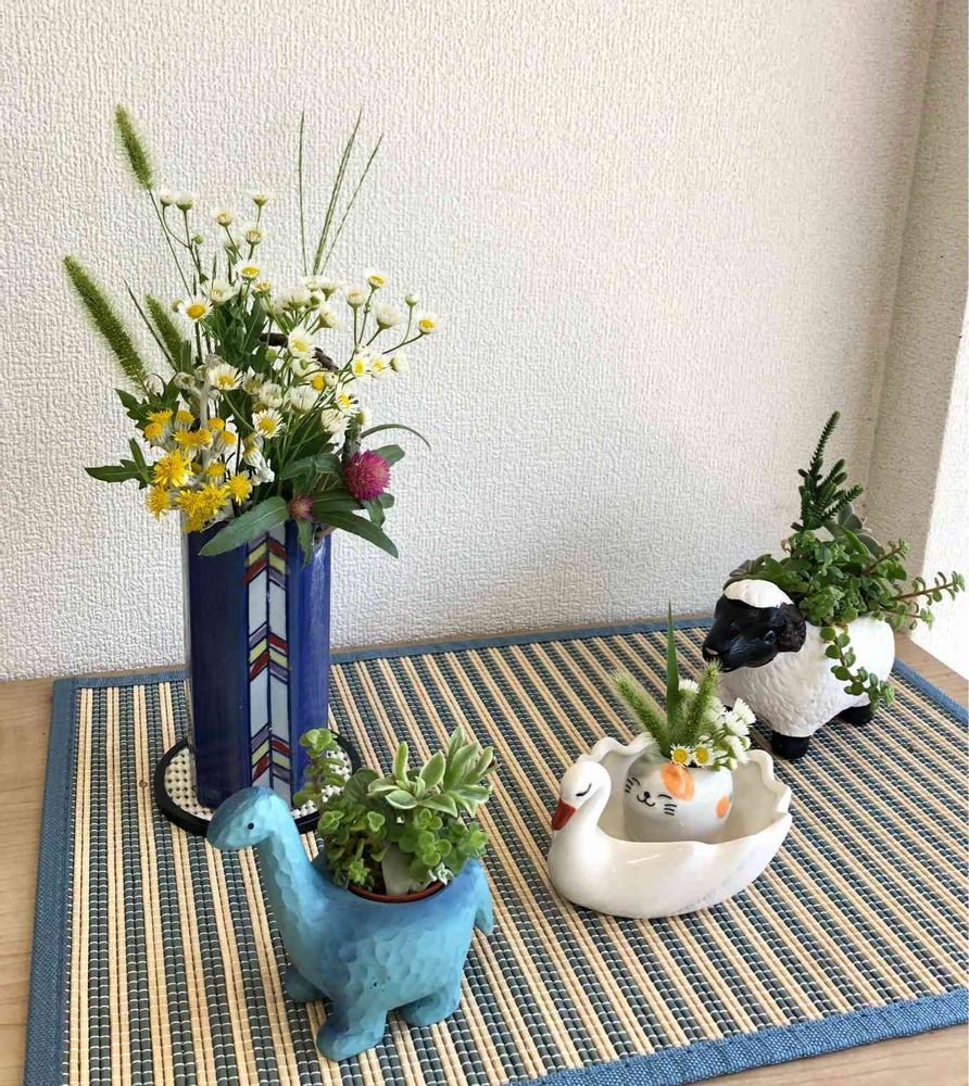 それぞれに可愛らしく微笑ましいです。左の花瓶に入れたエノコログサはもう少し長めにふわっと入れてもいいですよ。身近な花材を使って生けるのはかんたんなようでなかなかむずかしいですが、アロマさんはよくまとめています。