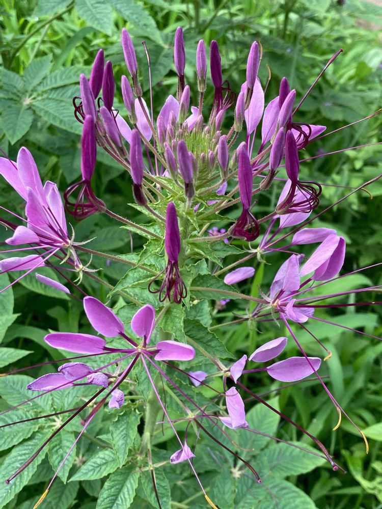 草むらで、紫色や紅桃色のツボミが天に向かって伸びている花を見つけました。「セイヨウフウチョウソウ」(別名クレオメ)でしょうか。四弁の花びらと長く突き出た雄しべや雌しべの様子が、蝶々の舞いに見えることから命名されたとか。熱帯アメリカが原産なので、夏の熱射には滅法強そうです(笑)。