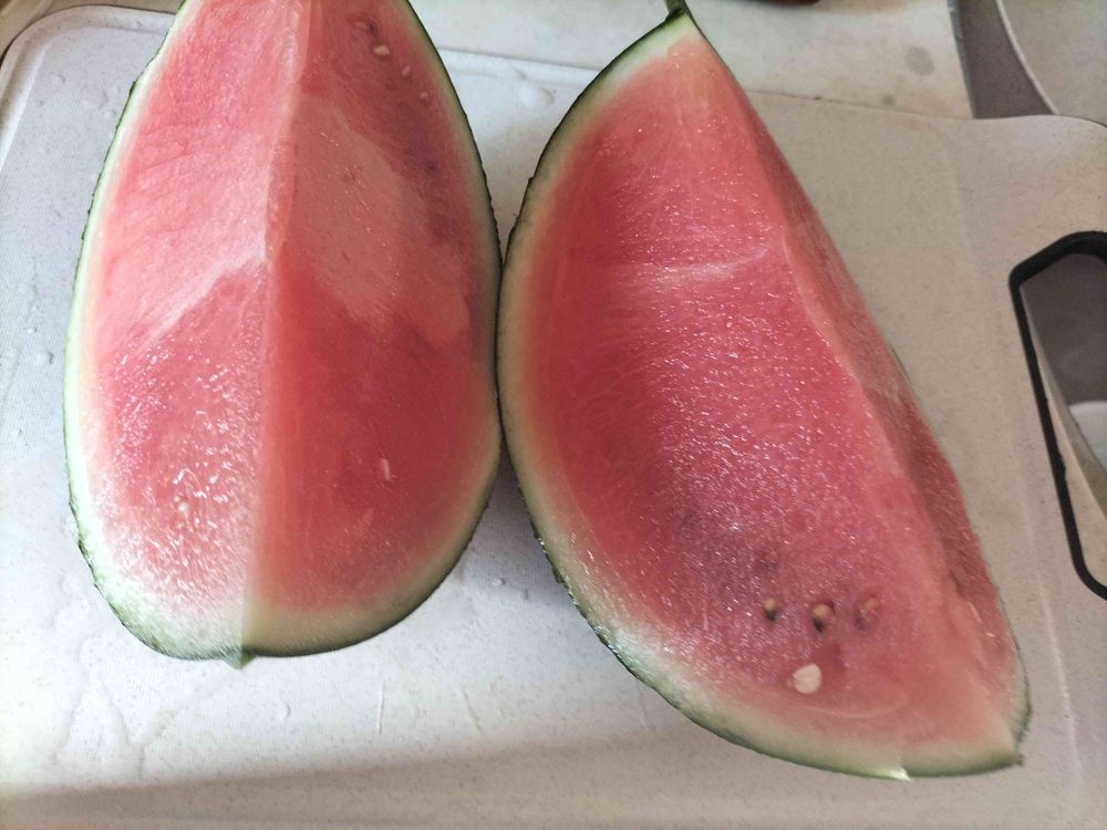 黒い小玉スイカが庭でできました。皮ギリギリまで果肉が赤いのに、甘くなーい。肥料が足りなかつたのかな