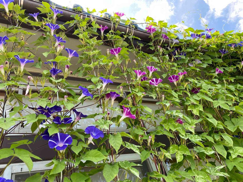 毎年恒例のアサガオのグリーンカーテンですが、お花が上がりすぎて、写真がうまく撮れません😅