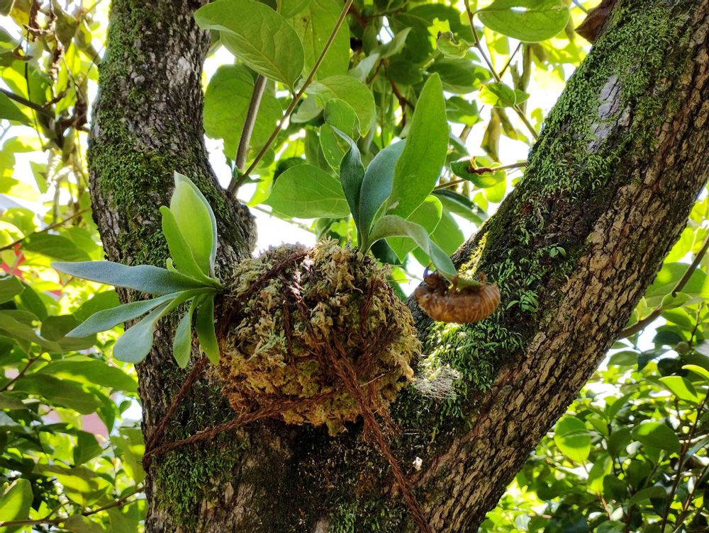 柿の木に苔玉ごとくくりつけて、着生を試みています。
