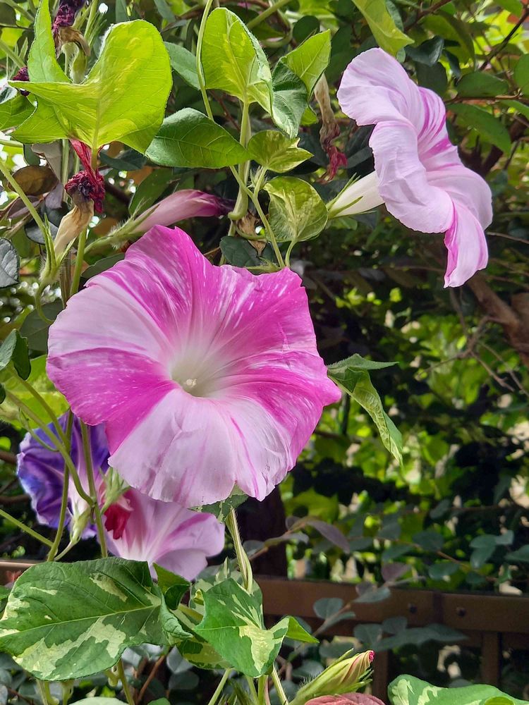 ご近所さんちの垣根に絡まって咲いていました~お花1つ1つ模様が違いますᐠ( ᐢ ᵕ ᐢ )ᐟ朝顔あるあるなのかな🤔