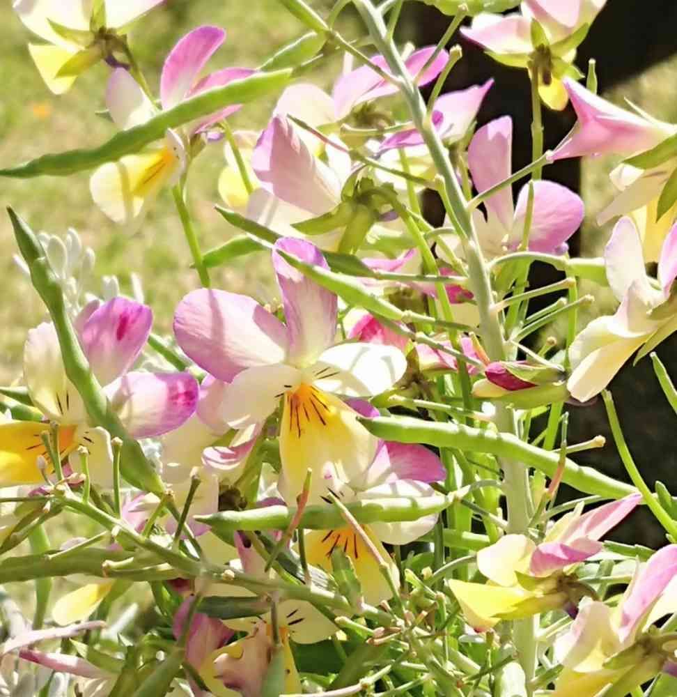 かわいい色のビオラさんですね。そろそろおしまいの感じですけど、種取りしようか迷いますね。うちもいま、このぐらいの状態のビオラあります。もうスカスカですけど。種取りして来年蒔こうかなぁーと思ったりd(^_^o)葉牡丹も同じように、種取り用残しています。