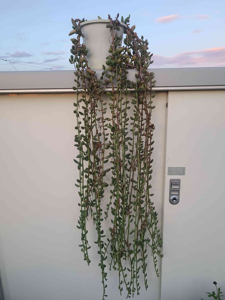 うちのを測ってみたらアーモンドネックレス21センチ、グリーンが12センチでした😰 液肥をあげないといけませんね。👍😊 あまり高い所に置くと 台風の時倒れないようにしないと 無惨な事になりますね😄