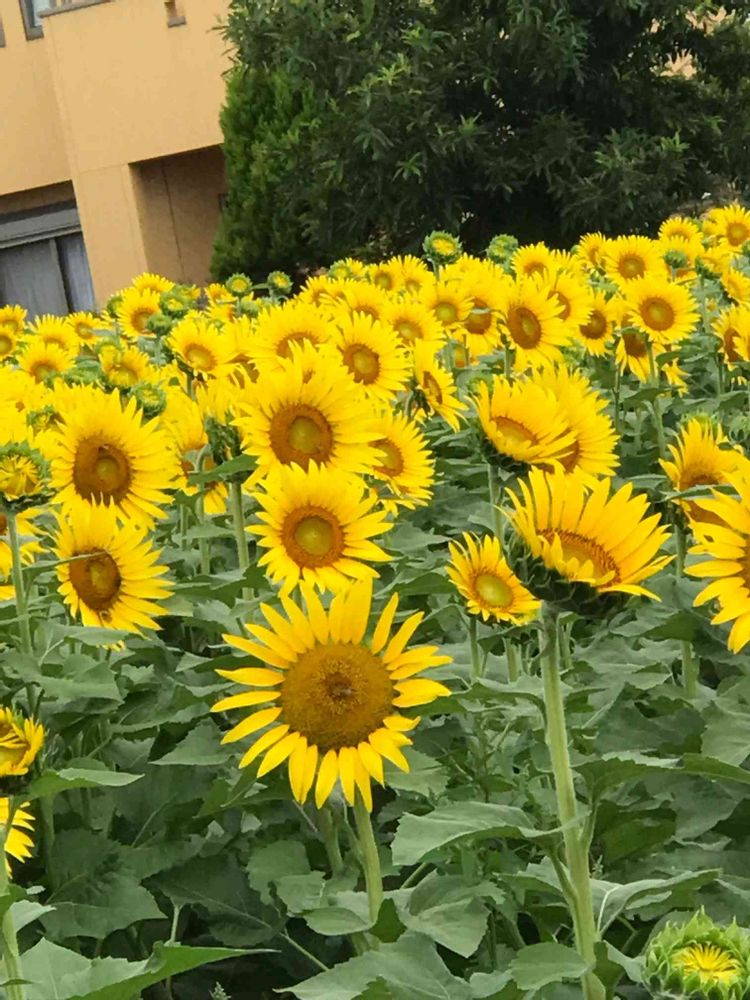昨日、車で🚗走っていたら、遠くから、黄色の景色に、何だろうと、近くまで来たら、向日葵🌻畑でした。背丈も同じ位に、綺麗に咲いていました。