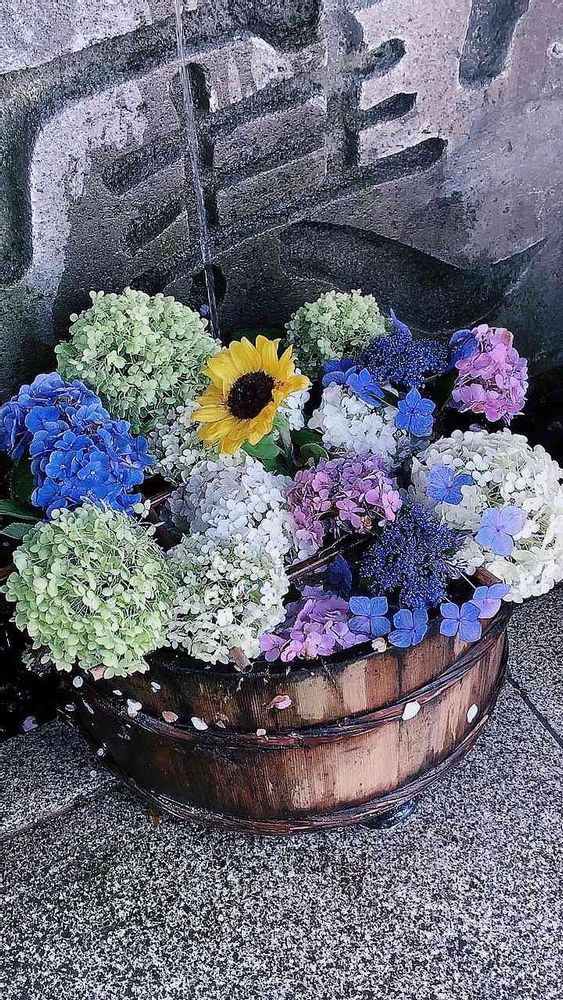 紫陽花とひまわりの花手水,可愛い,青い花の投稿画像