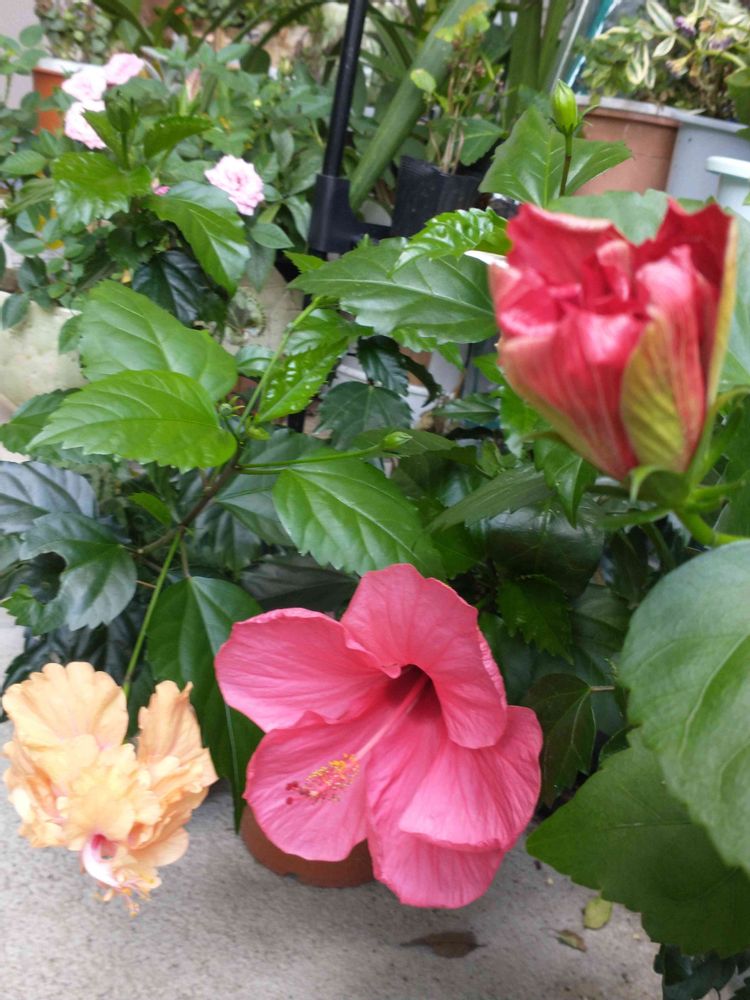 今日のハイビスカス 久しぶりに三種💖❤️🧡同時に咲くか〜