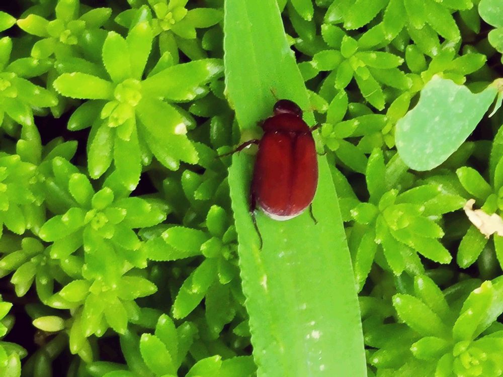 セダムの緑が綺麗だったので写真を撮ろうと思ったら、赤くて可愛いコガネ虫が❗