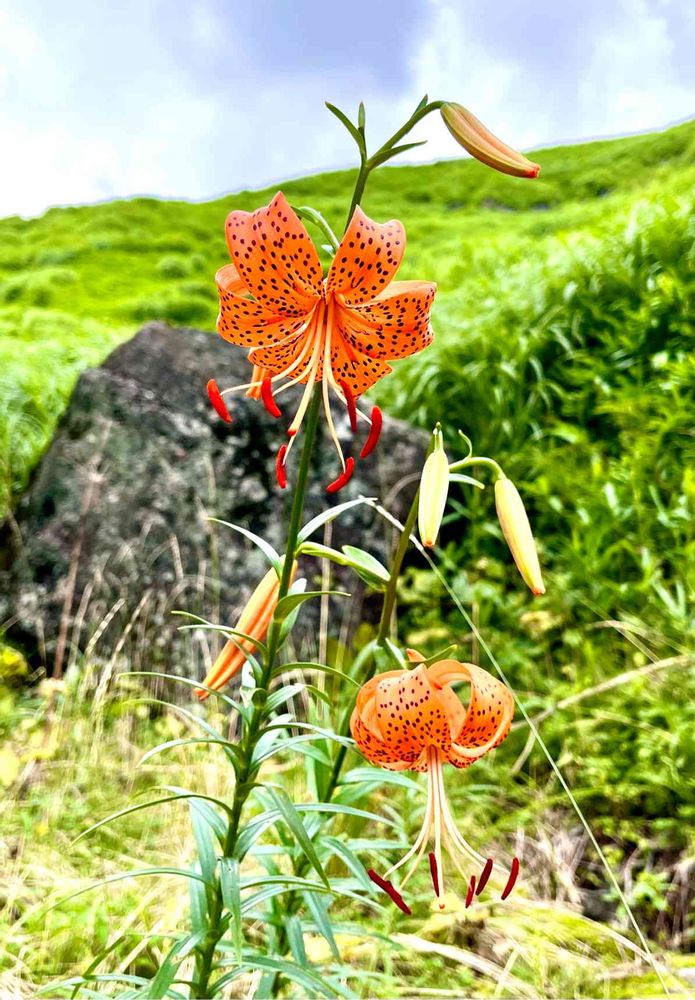 夏休みに入り、草原にコオニユリが鮮やかなオレンジ色の花を咲かせてます。