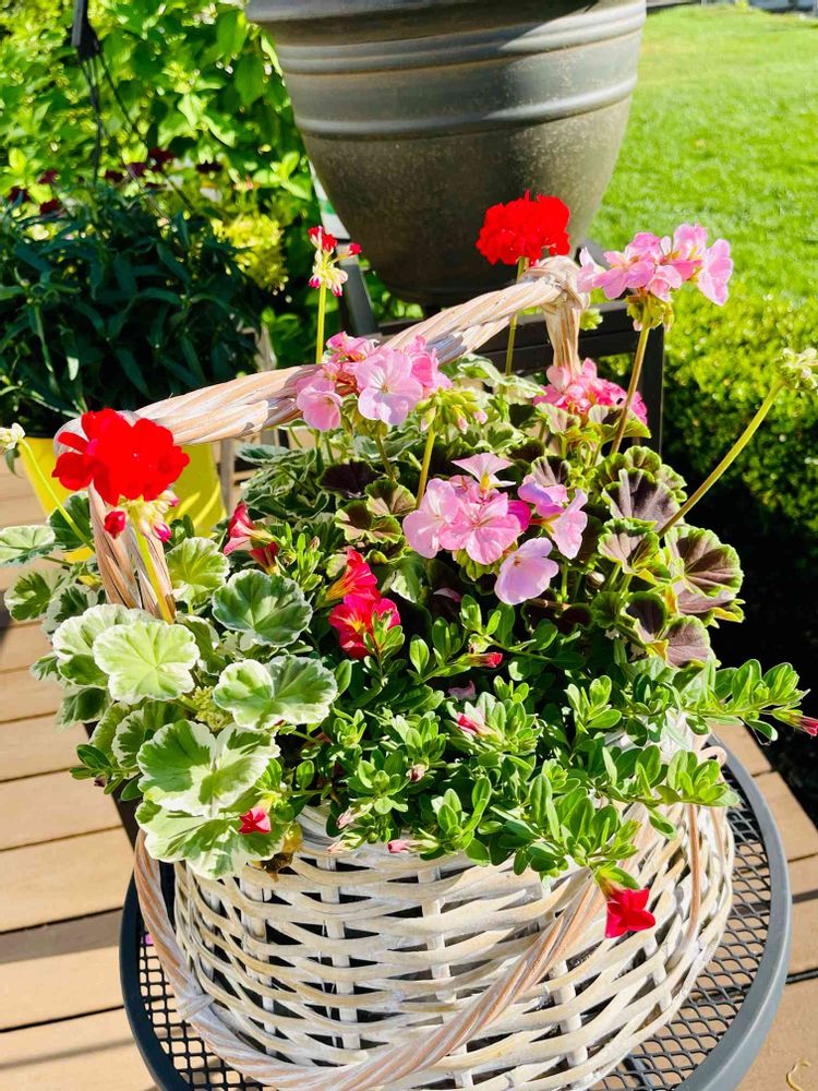 カゴに寄せ植えしたゼラニウムとカリブラコア、成長して格好良くなってきました
