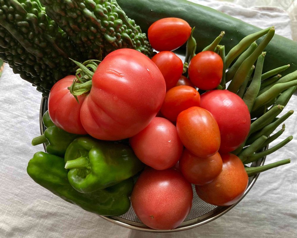 おはよう御座います。いつも素敵なお花を有り難うございます。暑さに負けずにお世話され、沢山の夏野菜が収穫出来ましたね。おめでとうございます。ご家族皆さんで美味しく召し上がって下さい。