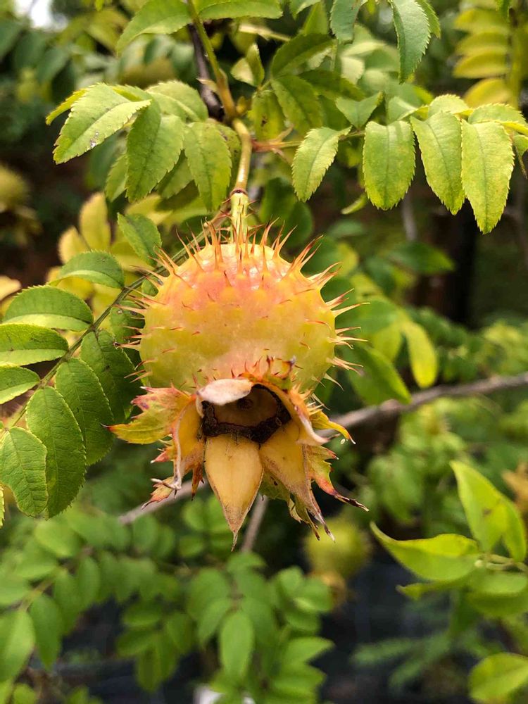 葉っぱが山椒の葉にそっくりなので山椒薔薇、鋭い棘がある実が黄色く色づいて可愛いですネ😚