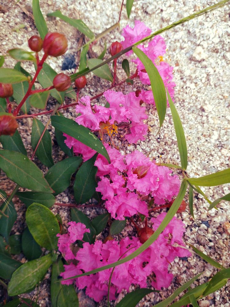 土の上に赤い花があるけど…なんだろう❓❓って覗き込んでみたら、百日紅でした。