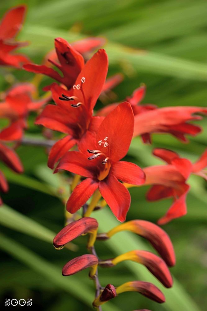 ヒオウギズイセン(檜扇水仙)と、ヒメトウショウブ(姫唐菖蒲)との 交配種で「クロコスミア」「モントブレチア」などとも 呼ばれます。