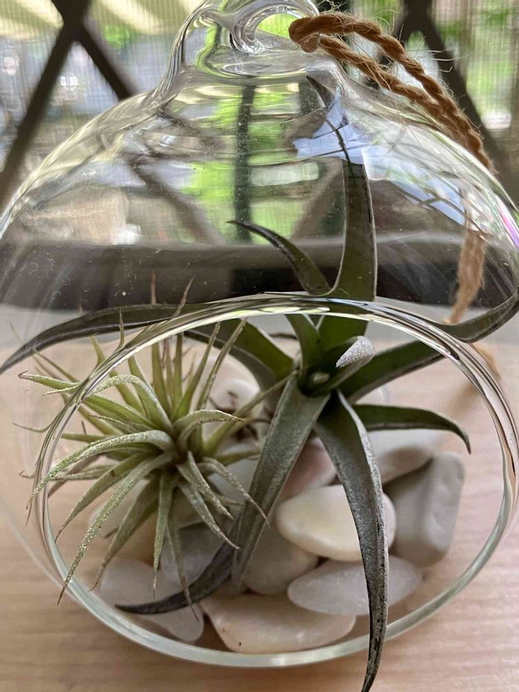 うちにも、このガラスさんと、そっくりなエアープランツさんいます。ガチャガチャで息子がお土産にくれた、恐竜の卵と一緒に🥰