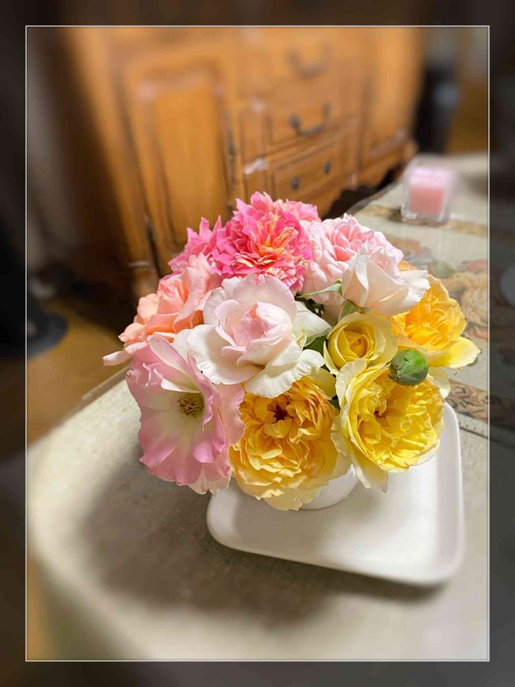 今朝の庭の薔薇🌹暑いので😵💦🥵朝水やりの後カット✂️して室内でたのしみます😋今日はすごく香りがいい💕レモン、ロクサーヌ、エウリディーチェ、クロードモネ、マチルダ、ヨハンシュトラウス、ストロベリーアイス、シンデレラ🌹今朝は全部名前覚えてた❣️今日は頭の調子がいいね👍(今朝は名前を確認してからカットしたので笑)