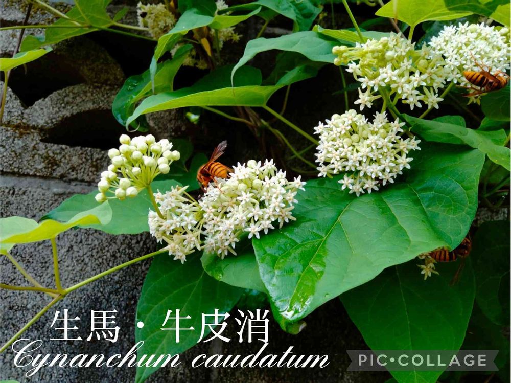住宅地の石垣に蔓に咲き垂れ下がる白くて見慣れない花。スズメバチが夢中で蜜集めをしていました🐝🐝🐝。そうっと静か〜に近付いて撮りました😅