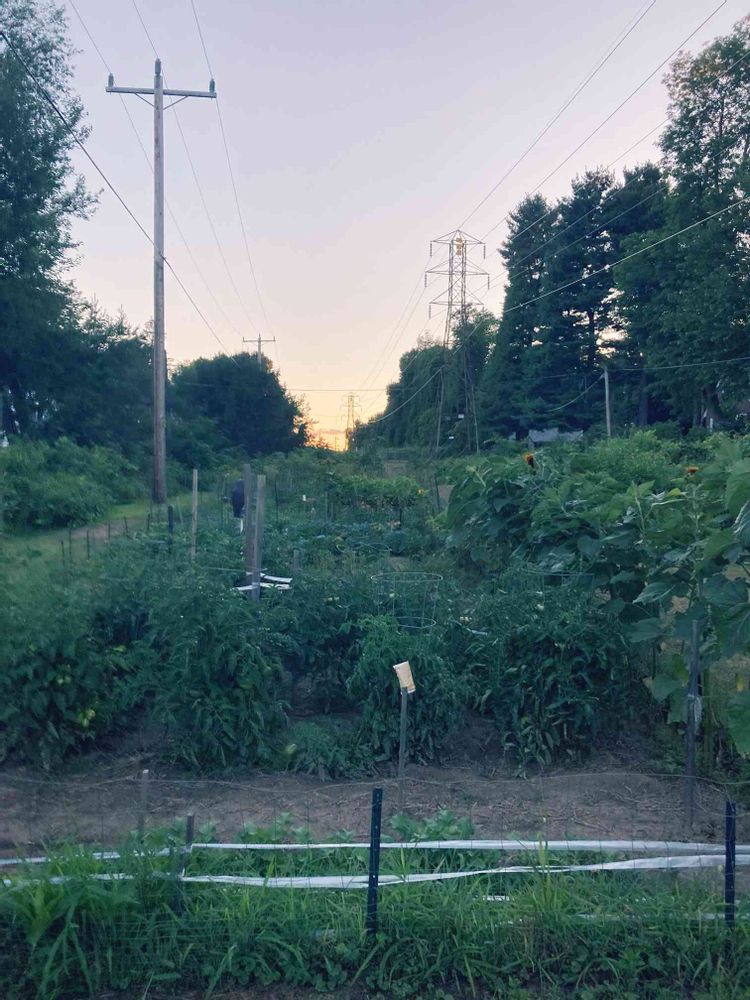 夕暮れの家庭菜園。見えにくいですが、正面にトマト🍅右端にはひまわり🌻です。