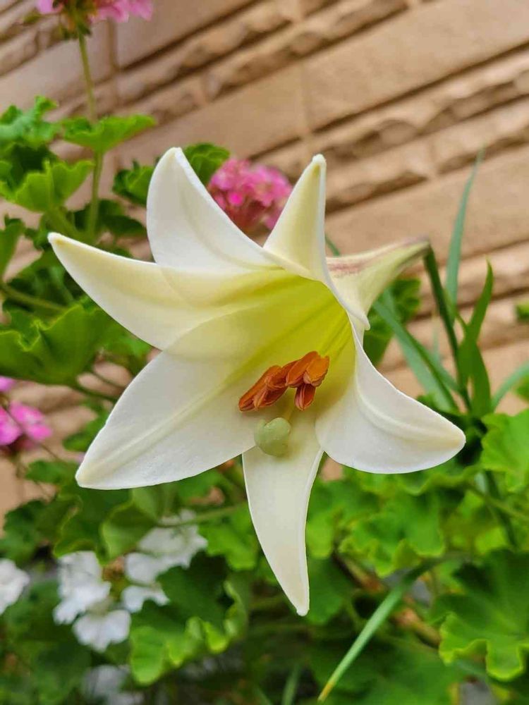 植えてないのにゼラニウムの鉢からこんな美しいユリの花が咲きました。