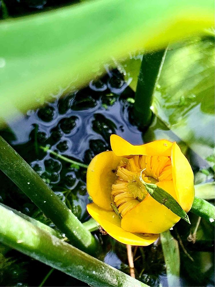葉っぱの陰に、まだちょっと眠そうなコウホネ発見☺️