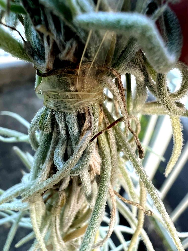 我が家のスパニッシュモスさんの大写しなのですが、見えにくいと思いますが、買った時のまま、透明なゴムで括られています