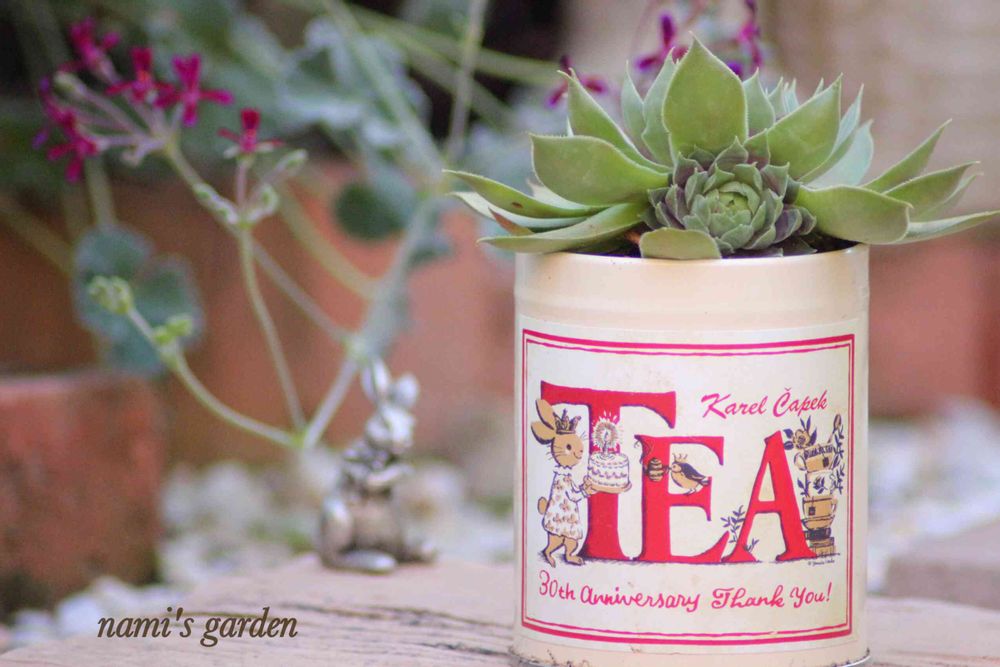 淡いベージュに赤が効いてる紅茶缶素敵✨多肉ちゃんが引き立ちます♪