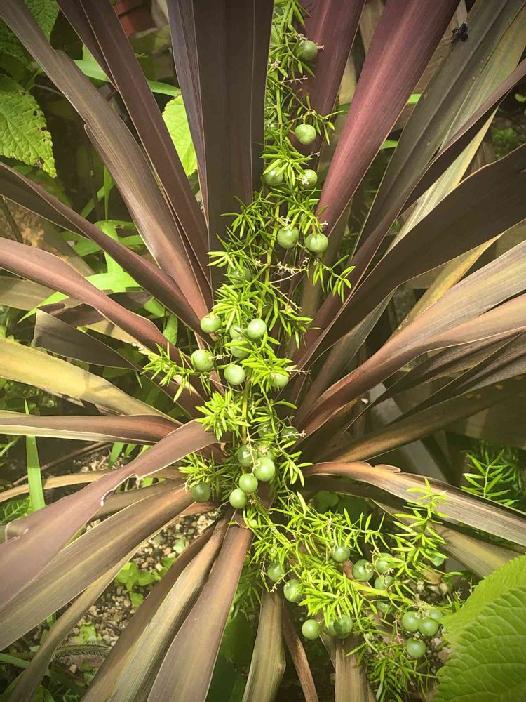 コルジリネに絡まっているアスパラガススプレンゲリー🌿🟢お花が終わりグリーンの実を付けてます🤗これから🟢→🔴赤に変化していくのてすが赤い粒々に変わるとそれも可愛いんですよ🥰