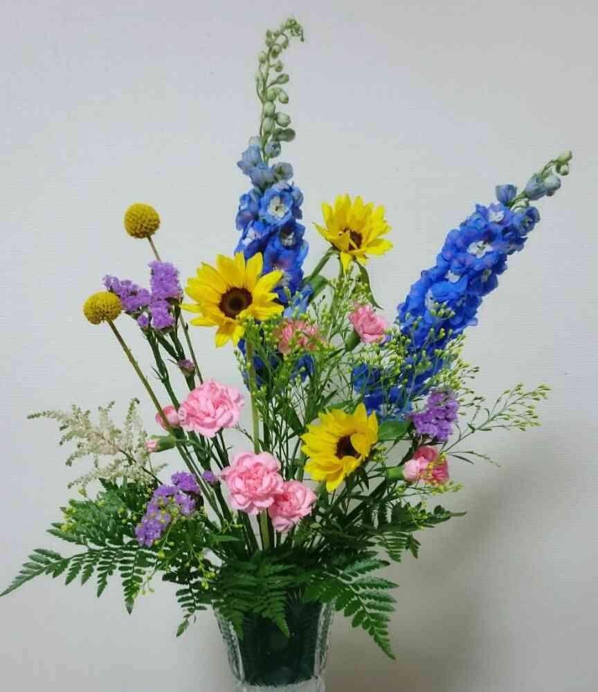 紫のデルフィニュウム、ヒマワリ、黄色のまるこいのは、クラスペディア、黄色の小花は、ソリダスター、紫のスターチス、左下の白いほわっとしたのは、アスチルバ、ピンクのスプレーカーネーション、足下にレザーファン🎵(*^^*)月2回アレンジしております❣