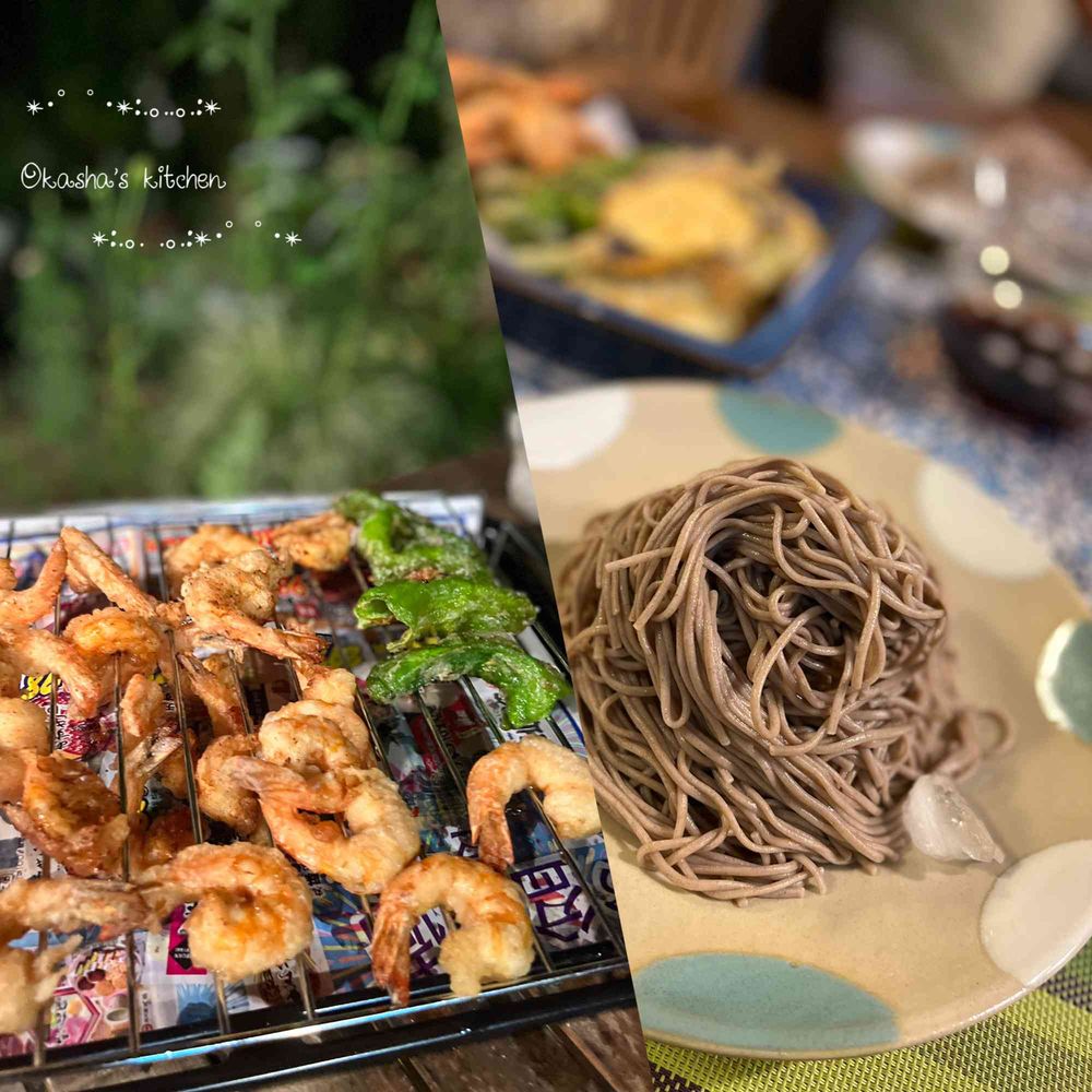 庭どれナスとピーマン🫑🍆を天ぷらにして、天蕎麦でいただきまーす😋