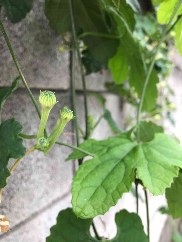 何の花の蕾か教えてください。ツル植物です。花の写真も送ります。よろしくお願いします。