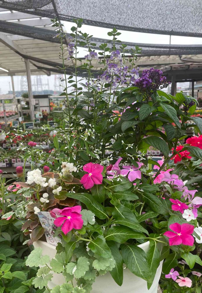 売り場で紫のヘリオトロープが背が伸びてしまったなぁ😅と思っていたので、これを活かす寄せ植えを作りました。背が高い花には背が高いアンゲロニア ウェッジウッドブルーを合わせ、白い小花がボリューミーなダイアモンドフロストをつなぎに✨