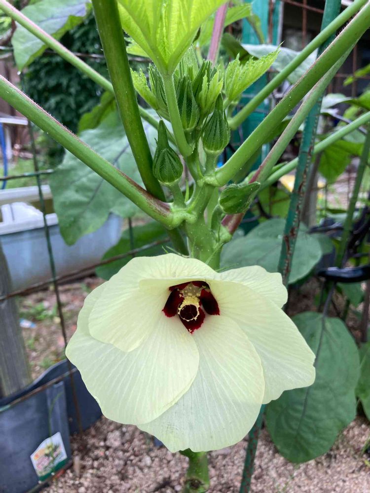 オクラの花初見です🌸こんなに可愛いなんて!!そして食べられるなんて!収穫も楽しみですね🥒