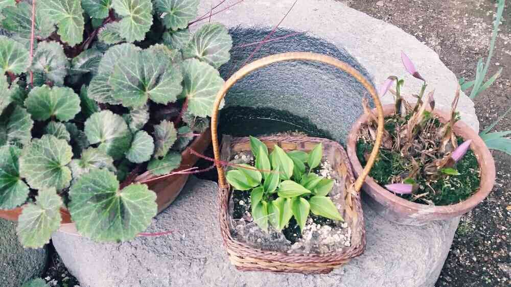 ユキノシタの葉の大きさから比較するとホスタの小ささがわかるかなと思って💦