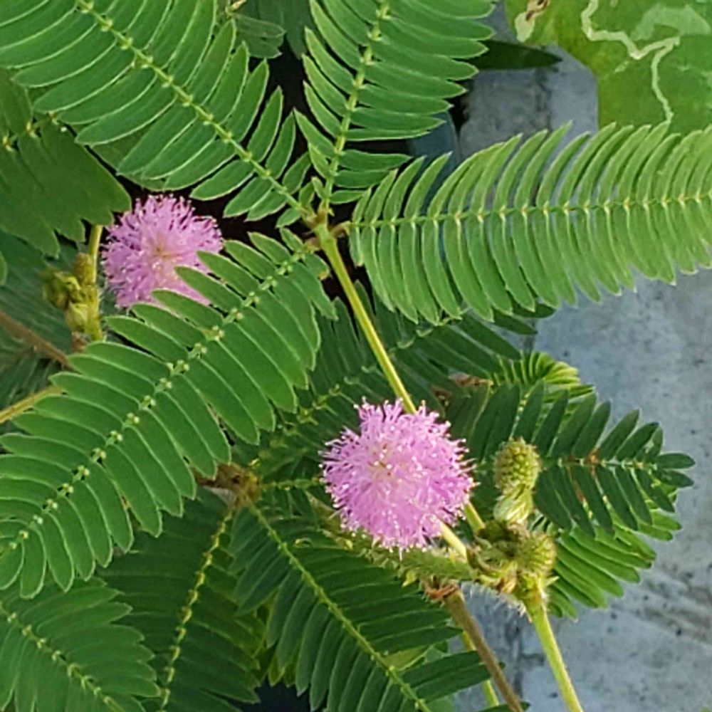 おじぎ草の葉でよく遊んでしまう。ふわふわピンクの花もかわいい*