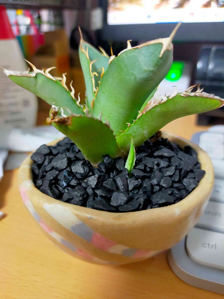 でもこのアガベって、おちょこぐらいの小さい植木鉢に植えてるぐらいまだ小さいのに、そんな子が子株って😒