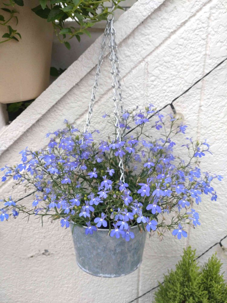 アズーロコンパクトの挿し芽がいくつか成功したので、そのうちの1つを小さなブリキの鉢で吊るしてます。