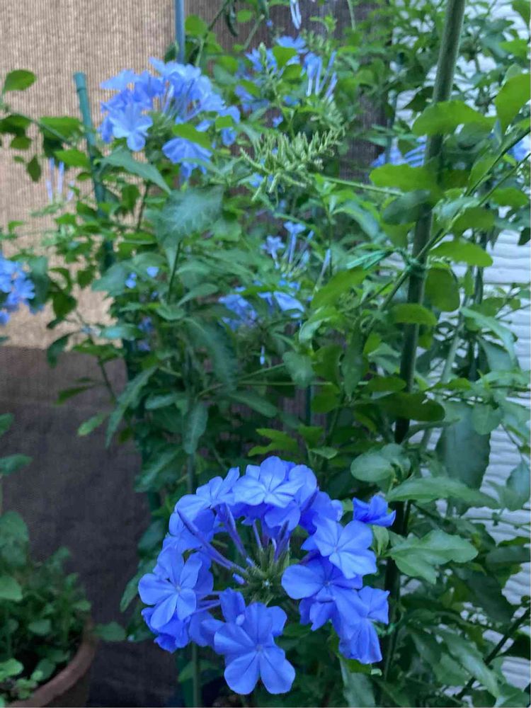 ルリマツリは、つる性では、ないのですが、生育旺盛で、枝を四方にビヨーンと長く伸ばすんです。なので、支柱を立てて折れないようにしています。お花が終わったら、短く剪定するつもりです。💙😊💕