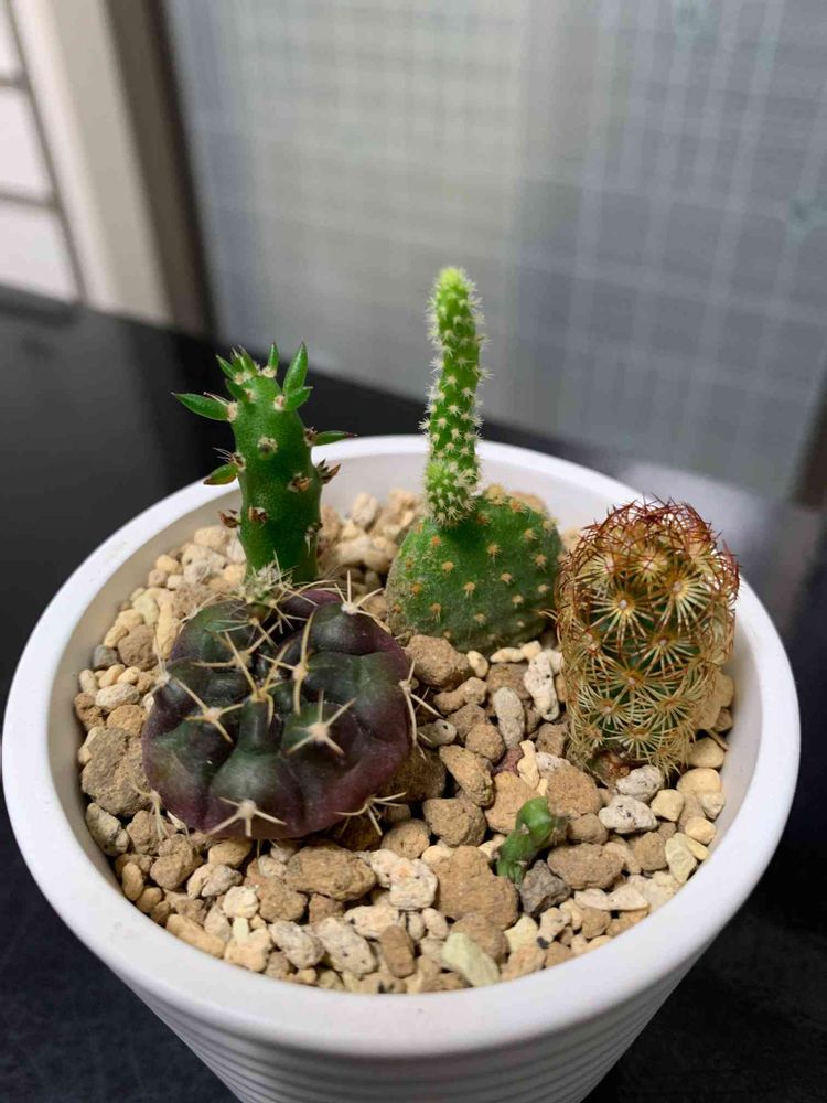 どう育つのか気になります!見たことないもので〜。左下のサボテン、黒くてカッコいいと思ってお迎えしたのにグリーンに戻ってしまいそうで残念です。日に当てると黒くなるんですかねー。