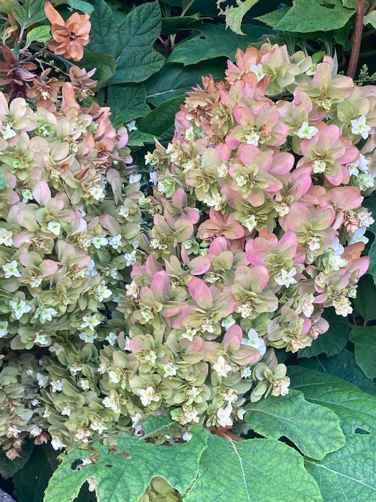 今朝の一枚のカシワバアジサイです。最初は白色、ピンクから緑に変化していく様子を楽しんでます。