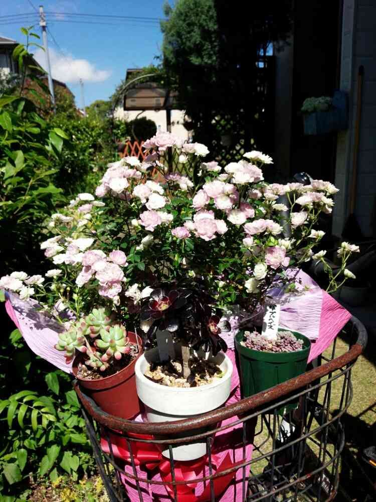 出勤前にパチリ♪♪娘の自転車籠にバラと四十郎さん多肉ですよo(^-^)o