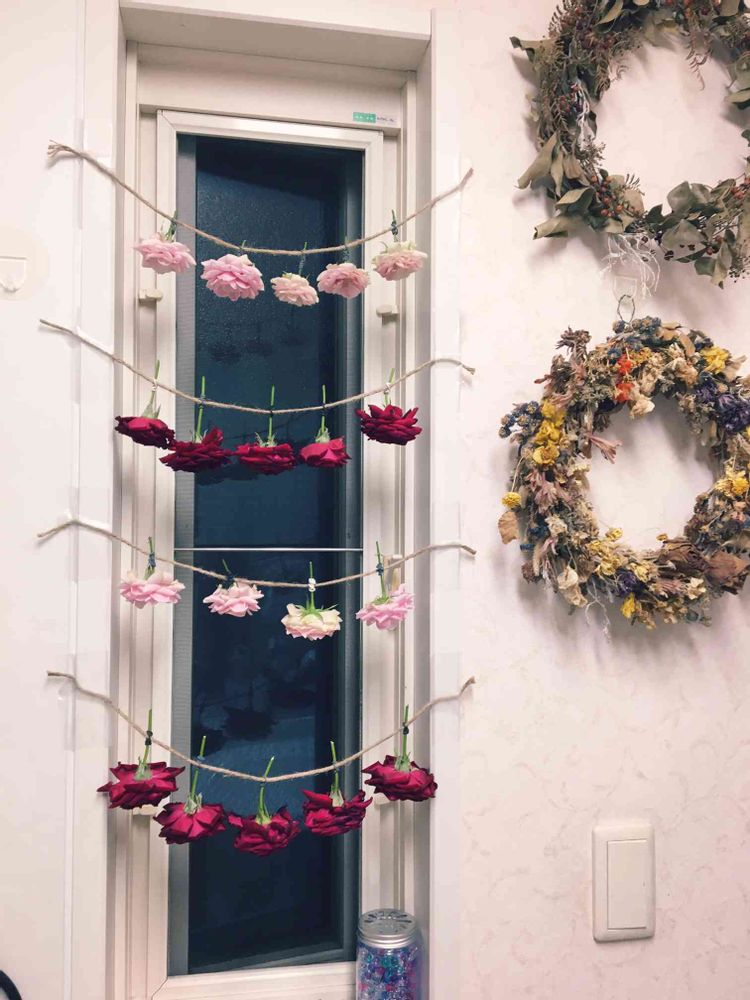 干してある可愛いお花たちも、お隣のリースの様に素敵に変身するのかしら、、、