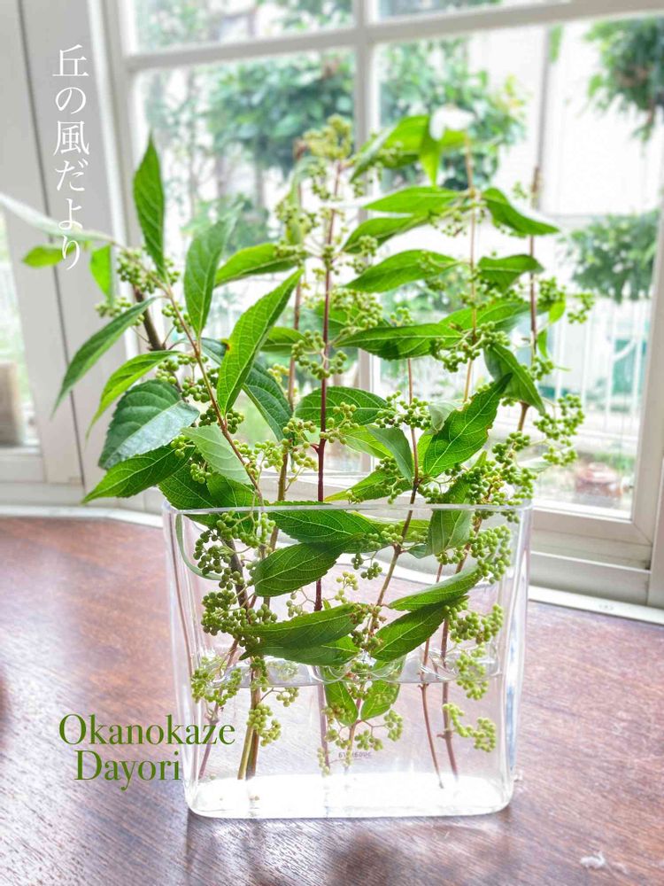 紫式部が茂り過ぎていたので、剪定したものを生けてみました😆度々登場の花瓶💦