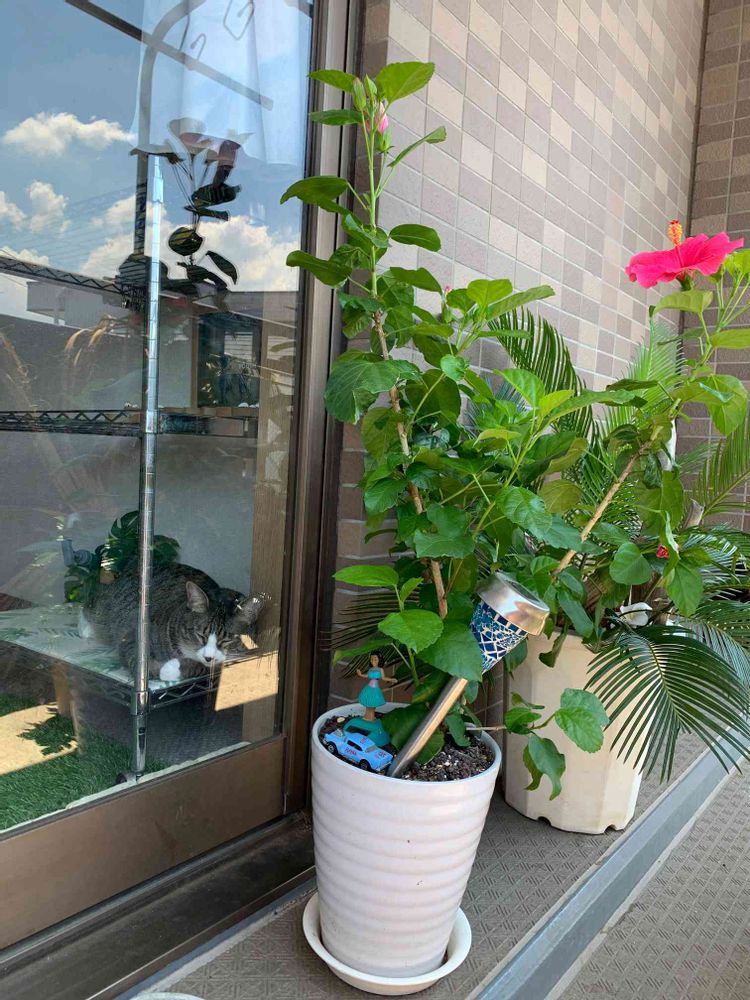 #ネコ#ねこちゃん#ミニカー#ハイビスカス#見守り当番