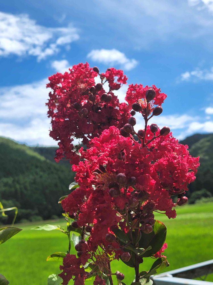 百日紅,田んぼの緑,真っ赤な百日紅の投稿画像