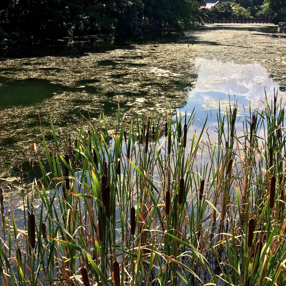 瀬にはこんがり焼けた蒲の穂がなんだか美味しそうに並んでいます。奥は弁財天。柏手を打ったら神社⛩ではありませんよと知らぬ人に教えられ。