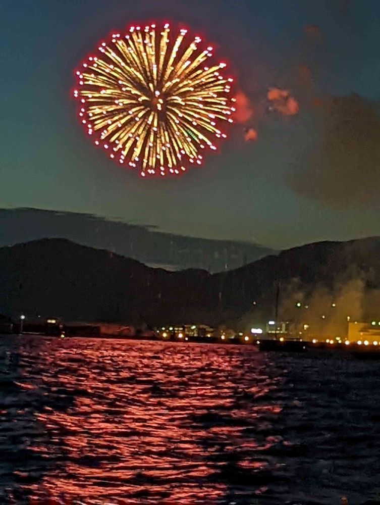船上から遠くに1つ別の場所で花火が上がってるのが見えました。