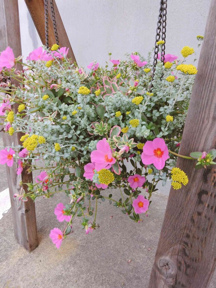 🍀ポーチュラカ・マジカルキューティー🍀と🍀ヘリクリサム・ライムミニ🍀がくす玉風に、ふんわり花ざかりです🥰💕🎊