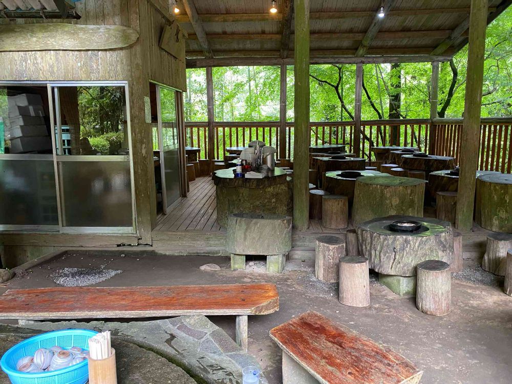 岩をくり抜いたそうめん流しが風情あるし、自分で焼くおいしい地鶏、郷愁を誘ういびつな形のおにぎり。ここ以上のそうめん流しはないと思っている。