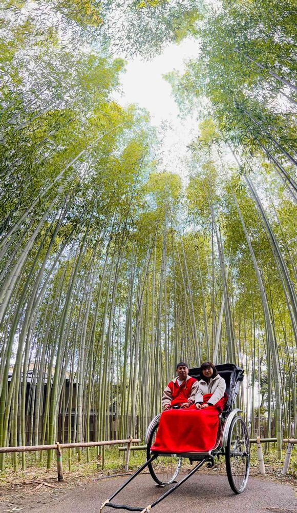 人力車に乗って行くとお兄さんが一番インスタ映えする場所に連れてってくれた🤗🌸竹林が頭上から天を覆うようだ🤗